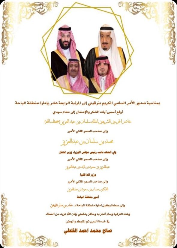 الاعلامي صالح المحجم Twitterren اقول للخال Salehalqalati حفظه الله تلقيت ببالغ الغبطة والسرور صدور القرار السامي بترقية أ صالح القلطي للمرتبه الرابع عشر وبهذه المناسبة السعيدة اتمنى لك المزيد من النجاح